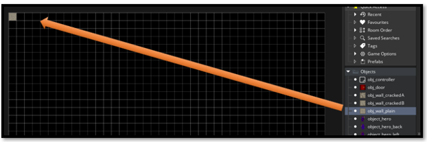 Drag a wall object out of the Asset_Browser from the right side of the app and place it into the first grid space in the room.