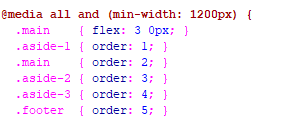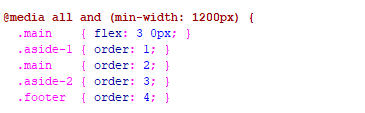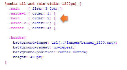 We are going to do the reordering of these divs in the CSS media queries. When we are on the largest screen size. We do not want our main div to be on top, but we want it sitting inside of the two asides on either side of it. So, we want our main div, at size 1200 screen size to be sitting at order number 2.