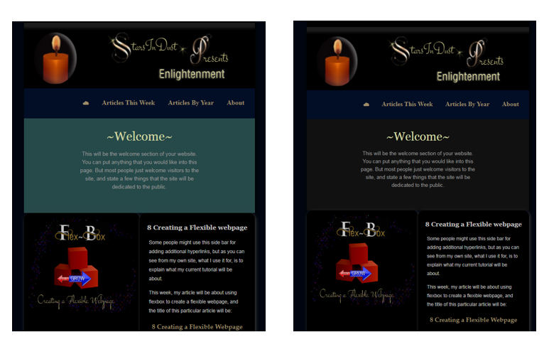 This tutorial will show you the same web page that I used for my own site. There are many designs that you can use for flexbox, but I do happen to favor this one. It is very flexible. It contains the main section in the middle, at full size. It has a side bar section on each side. These side bars can be used for anything. Such as images, or hyperlinks to other sections of your site or even external sites.
