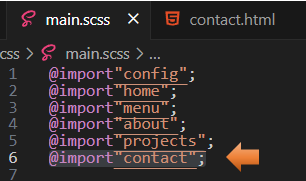 Here you want to remember to import the contact file at the top of your main.scss file