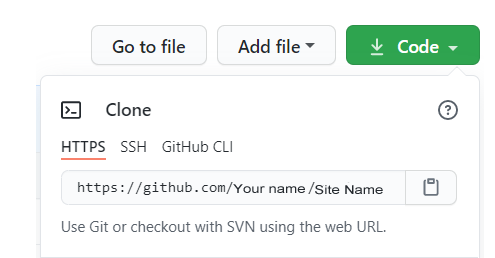 - Locate the green button named Code and click on it. The GitHub URL will appear.