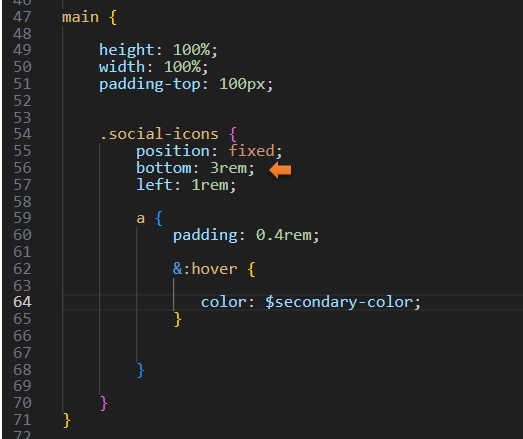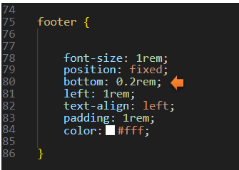 Notice how we set the footer to rest 0.2 above the bottom. This is not only setting the positioning to have space above the botton of the page, but it is less then the 3 rems that we set for the social media icons, so this will sit below them. Again, since the footer is at a fixed position at the bottom, we need to set where we want it to sit above the bottom.
