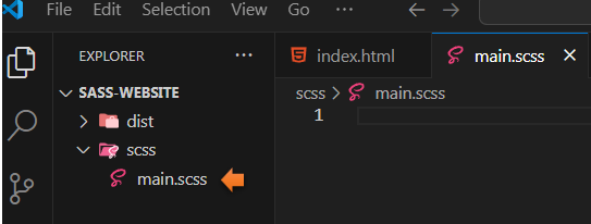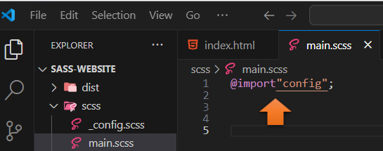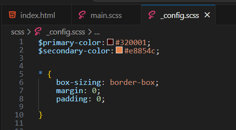 Open up the main.scss file that we had just set up. We need to import that config file that we just created, so our main file will have access to it.