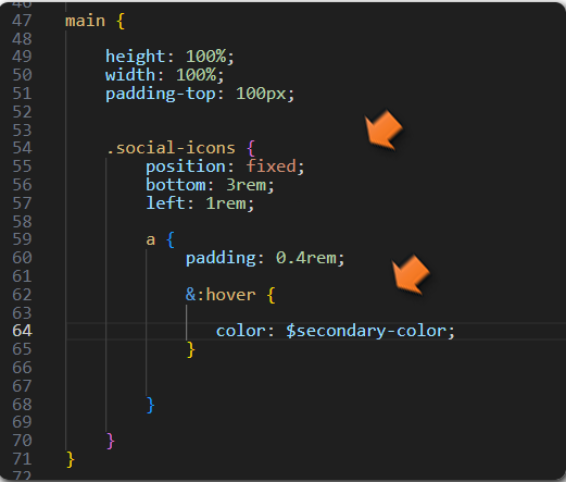 Notice that we have nested some of the code in the .main class rule. The Social icons and the hover were nested inside of the rule.