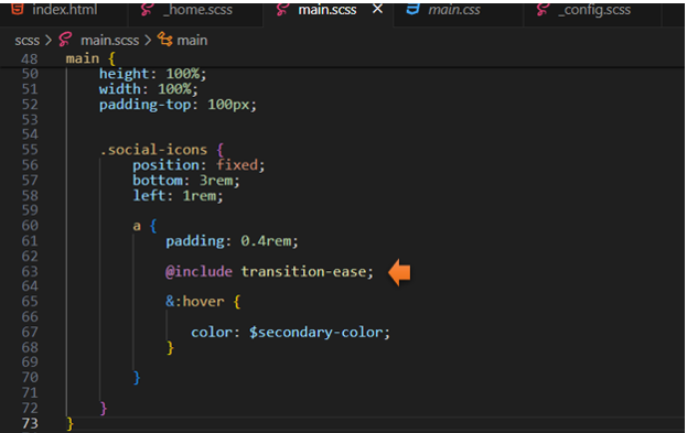 In order to use our new @mixin, we need to @include it somewhere. Here we want to target the hover, on our social icons, which are inside of the .main rule.