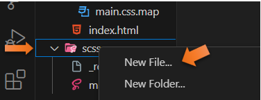 Create a new file, by right clicking on that SCSS folder and choosing new file.