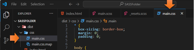 Now look at your regular CSS file, and you will see that it has compiled the code into our CSS file. You will see that it compiled at the top of the regular CSS file