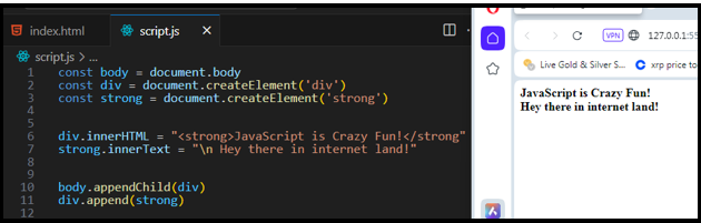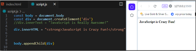 Don’t worry, we do have a fix for that. Instead of using those other two options in JavaScript, we must specifically tell JavaScript that we are writing in HTML, and we want thing to work in the exact same way that it works when we work in the HTML, which means we will write tags, but we do not want our tags showing on our webpages.