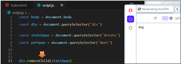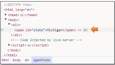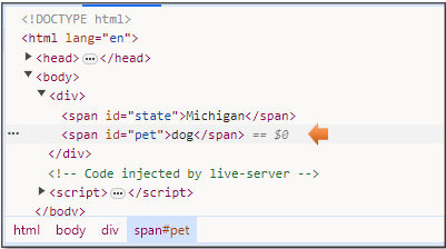 Now let’s check that out in the Inspect mode of the Opera browser. You will notice that the entire span for the #pet element is gone. All we have left standing here, is our span for the #state.