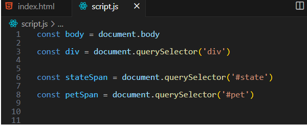 We use querySelector is used to find and select a certain element. Here we are using the pound sign to grab the two spans that we created with the named ids.