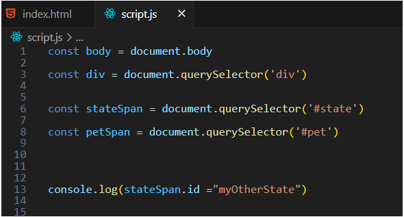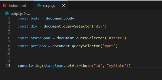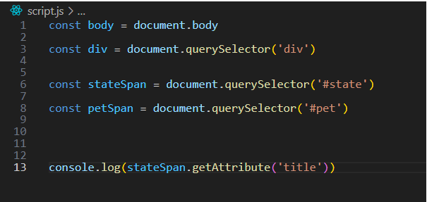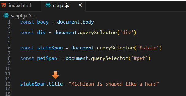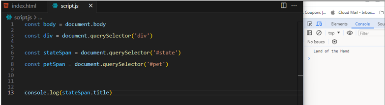 As you can see the above method does work, and if we want to impress someone, we could certainly use it. But how if we don’t feel like impressing anyone, and would just like to accomplish the same thing as efficiently as possible. Well, don’t worry because there is a method for that and it is indeed easier. Just attach the const that we used for our span created will the query selector, use the dot element and attach it to the name of the attribute in the name value pair.