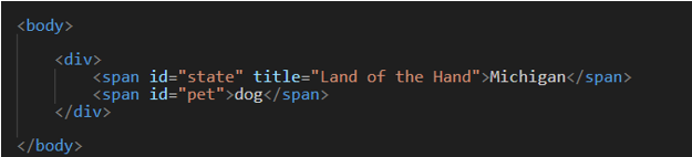 You want to add that title tag inside of your html file, notice that the id is also an attribute. Yes, it is a name value pair and it is what JavaScript can use to connect to this specific element.