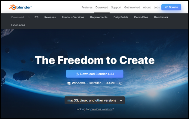 You can download the latest version of Blender from the website here. As of this writing, the latest version is 4.3.1. It is constantly being updated and that is because this project has a fantastic bunch of web developers who are dedicated to making sure that this program has the latest and greatest bells and whistles. And if you don’t think that just because this software is free that it can’t be worth a whole lot of anything, then you need to think again, because you will find that Blender is everything that it says it is, and a whole lot more. A full functioning 3D project that is just perfect for creating just about anything in this world of 3D that your heart desires.