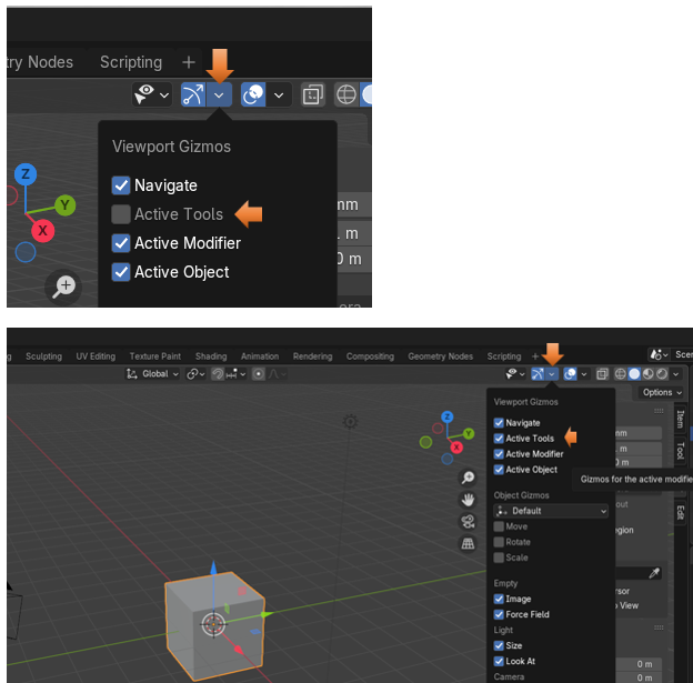 If you have your Active Tools checkbox unchecked here. Just check the box, and you will see the Gizmo back on your object again.