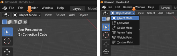 We want to start out in Object mode. Which is the default mode when you start up Blender. But just in case you have been searching around a bit, before getting to this tutorial, make sure you go back to Object mode. Hit the little arrow at the right of this textbox to find it in the dropdown.
