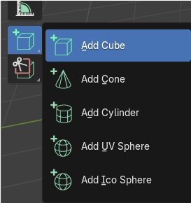 This Add Cube button on the Tool panel comes with a little arrow in the right-hand bottom corner. So, it has other Options. Here, you are able to select more objects, and you are not just restricted to adding a cube.