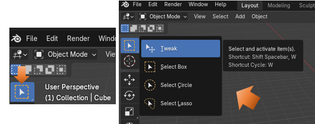 As you can see from the drop down that we can do all types of selection of the object. We can Tweak, Select Box, Select Circle or use a Lasso to select the object. It also gives you the hot keys on the keyboard that you can use instead to make these selections faster.