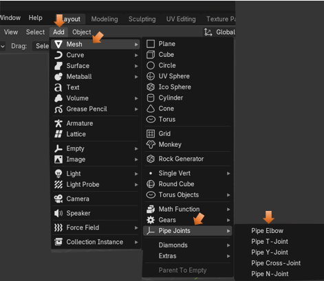 If you had added the extra mesh objects to the Blender program, you may have an easier time of creating these pipes then just using this tool, and trying to build things from scratch.