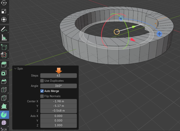 Now grab the Spin tool, and spin this face. Notice that for this one, I upped the steps to be 43. Setting the steps to this amount makes it a nice-looking ring.