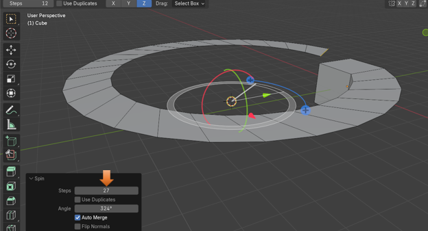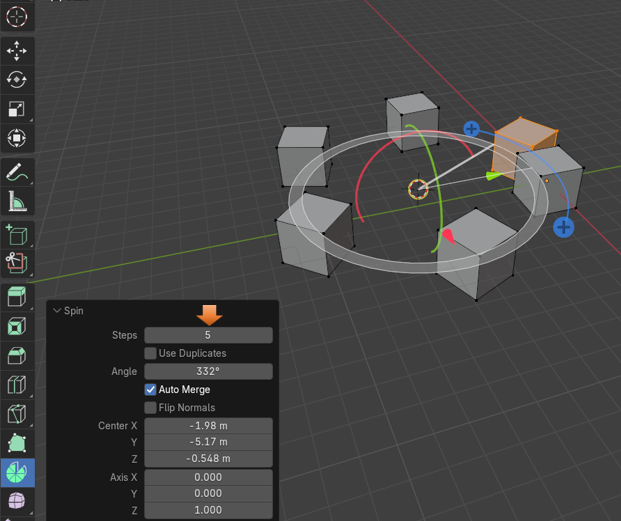 When that spin icon appears you can simply drag the mouse around the circle of this new spin gizmo, and it will start to duplicate the object in a circle around the center cursor icon.