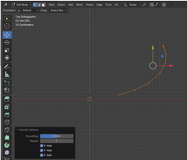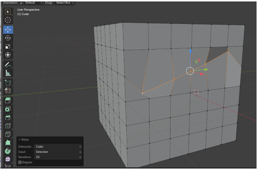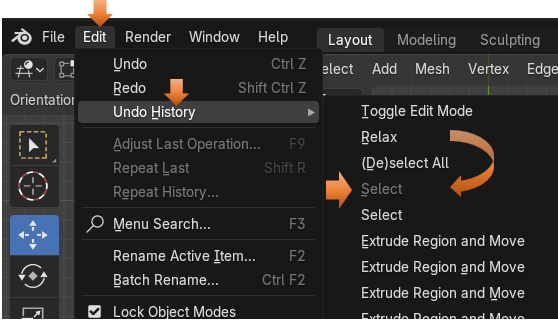 Blender also has its own method for smoothing these vertices out and we can try that. Take those vertices that we created in Edit mode back to what we had, before we did the Relax maneuver on it. You can find your history in the Edit menu at the top of the screen.