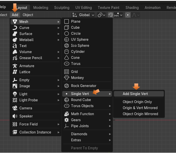 Now, with the extra Mesh tools enabled, we can add this Single Vert in Object mode. You will also find that just adding this Vert, will throw you automatically into Edit Mode.