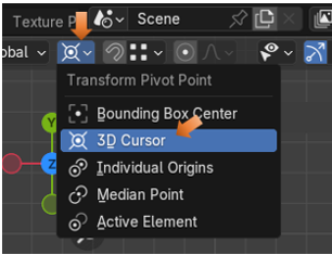 Now we want to move the Pivot Point to the 3D Cursor. Go to the top menu, and find the Pivot Point Menu. We want to select 3D Cursor to have the Pivot point at the same location as the 3D Cursor.