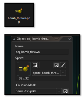 Now make your sprite and your object for this. This should be a familiar process for you now. This bomb object is different from your other items, because it will be doing some special stuff like moving across the screen, as if it is thrown by the hero. There fore instead of being created by either a script or the controller object, it will have its code directly placed inside of the bomb object itself.
